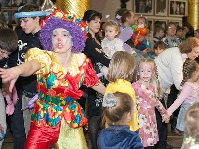 Программа праздника оказалась масштабной. Сначала детей в фойе развлекали клоуны в костюмах популярных детских персонажей. Здесь была и Мальвина из «Приключений Буратино», и Каркуша из телевизионной передачи «Спокойной ночи, малыши». Детей веселил настоящий ковбой, а также зайцы, белки и прочие веселые персонажи.